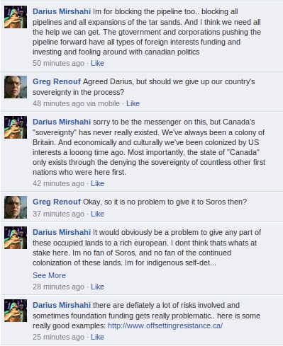1. The pipeline is not a Canadian issue. It is a global issue. Global capital is funding it and global capital will benefit from it and the global atmosphere will suffer for it. If global activists are NOT allowed to be involved in opposing this pipeline, then I feel like we haven’t got much of a chance of protecting land, Aboriginal rights and Canadian resources. By not allowing help and support and solidarity from around the world, we are small.