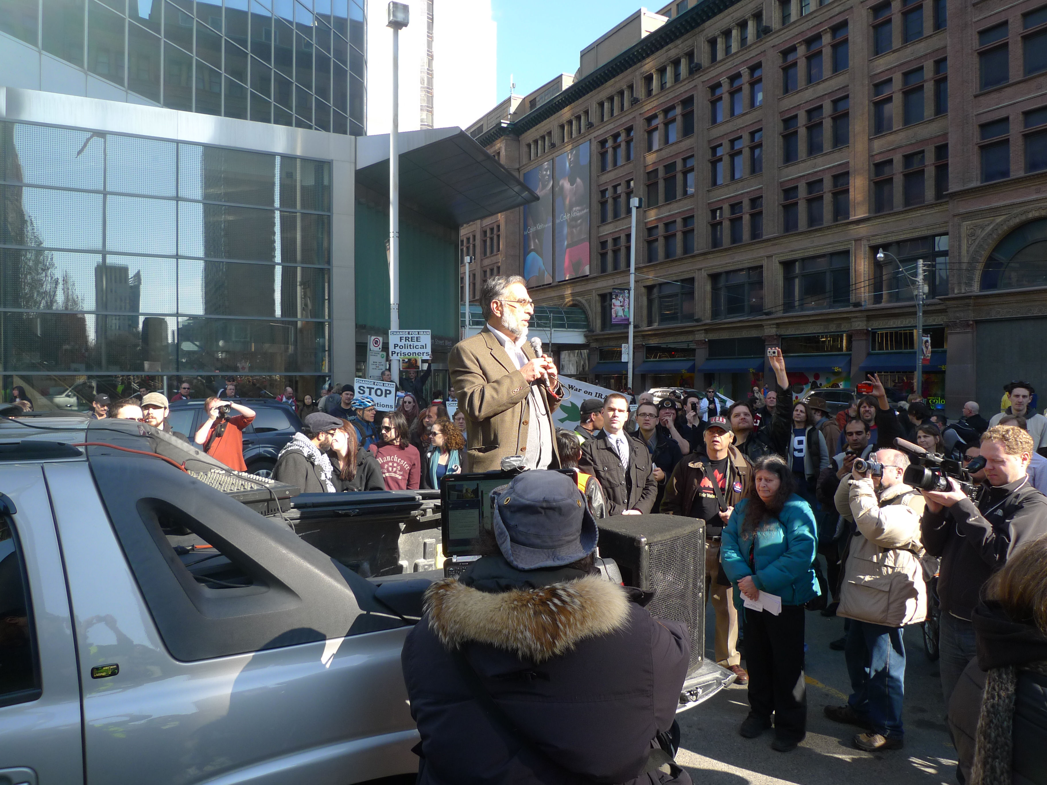 Now, this is where the story starts to get weird. Because, right after his speech we had Mathew Carroll from Leadnow.ca get up on the “Al-quds truck” and call for a Canadian Spring! Followed by a friend of Jon Allan’s who was supposedly one of the leaders of the Arab Spring!