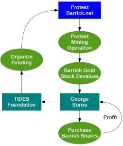 My story was a theory I was sharing about how George Soros could benefit from the activities of ProtestBarrick.net. I had been told, by two separate sources, that Sakura admitted to them ProtestBarrick had used the TIDES Foundation’s money laundering service to collect tax-deductible donations. Soros had bought a lot of Barrick Gold’s stock at the time, and the theory was that he could have taken-advantage of the protests against Barrick to purchase it at a lower price.