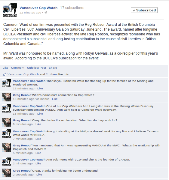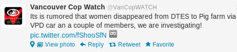 I discovered the connection between Cop Watch and VANDU a few days ago through their page on Facebook. Here’s the conversation I had with them: