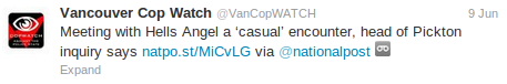 And then, in the last day, it looks like they are continuing the campaign of FUD about the Missing Women’s Inquiry- very similar to what I wrote about yesterday when I asked if Wally Oppal is being setup to look like he is working with the Hell’s Angels. First they tweet the story that David Eby shared: