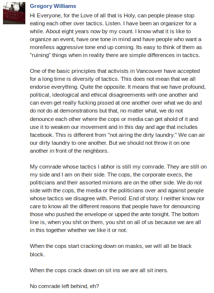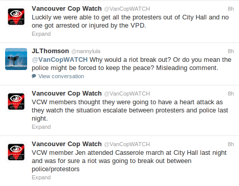 Notice how they tried to misrepresent what actually happened? “Nobody got…injured by the VPD” is typical of how they frame things- funny how they left out the assault on an older man! Way to go Cop Watch, you are only further proving that you are the wrong people to be doing the job that you have assigned yourselves.
