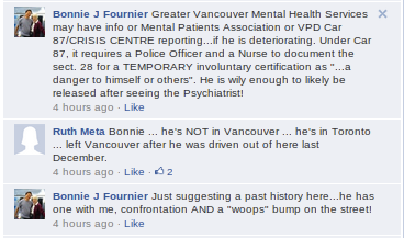 But, also, another registered nurse, Bonnie Fournier (who is connected to the Pickton case) has laid-out a plan to have me detained for a mental health investigation! I’ve heard of ‘car 87’ being used for such attacks before, but never did I imagine to see someone actually write about it on Facebook!