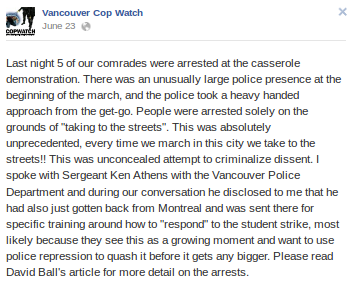 When I read Vancouver Cop Watch’s take of what happened it sounded like something really bad happened again. That said, one cannot take these people seriously- they have a serious problem with David Ebyesque grandstanding. What VCW explained to be an “unprecedented” “unconcealed attempt to criminalize dissent” was anything but. What are these people’s agenda?