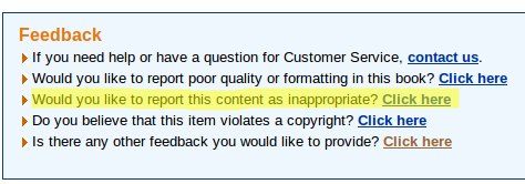 When the page comes-up, press “click here” beside the text that says “Would you like to report this content as inappropriate”. You will then be asked to give a reason why Kevin’s book is inappropriate. Write what you think is appropriate here- I’m sure you can figure something out.