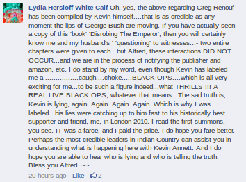 Annett is selling his books on Amazon.com and using them to build a sense of ‘credibility’ with others. The interesting thing about his most well-known book is that one of the people who was quoted in the book, Lydia White Calf, says that most of the words attributed to her were not what she said! Basically, the book is as much of a fraud as the ITCCS’s fake lawsuit. Here’s a statement she made on Alfred Webre’s Facebook page yesterday.