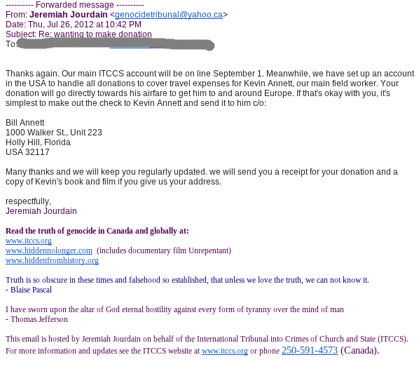 One of the key indicators that Kevin Annett is a con artist is how he uses an online alter ego to take-on things he doesn’t want to attach his name to. Annett uses at least one online alias named “Jeremiah Jourdain”. This has been pointed out to me by a number of people- it was even mentioned by the Six Nations elders in their video denouncing him and stripping him of his native name (which, curiously, he keeps using).