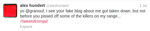 I thought that, once he was imprisoned, I wouldn’t have to worry about Hundert’s stalking any longer- at least, not for the next fourteen months. Unfortunately, I was wrong. Hundert made an assumption that I was the person who created a satirical website titled “Alex Hundert’s Prison Blog”- and, he had someone on the outside relay a rather gruesome threat to me on his Twitter account: