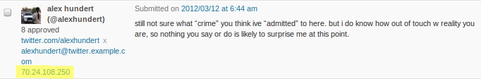 I wasn’t certain who made the website at first- but, being more angry than he is intelligent, Hundert made mistakes that exposed himself. He posted here on my blog using the same computer and IP address for personal comments as he did for comments from that blog: