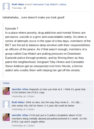 When I began writing about Cop Watch I was attacked by their members. One of their members, Ann Livingston (who leads the Vancouver Coastal Health (VCH) funded Vancouver Network Of Drug Users) made an absurd comment online that I “only go after women”. I have an ongoing complaint to VCH about this issue- but, it seems that Cop Watch hasn’t learned their lesson yet. Jennifer Allan tries the same attack on the arresting officer: