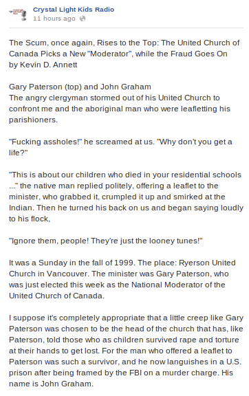 If you want to understand how far Kevin Annett has fallen, this story is the perfect indication. I’ve been tracking videos about Annett posted to YouTube for several months now. As time passes, and Annett’s support wanes, the number of videos has drastically decreased- as has the significance of the people who are posting stories about him. Today I found a very disturbing example of that…