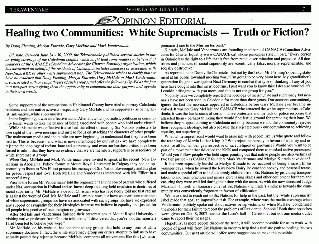 Guérin decides to go all Curtis Nixon on us and pull the ‘racism card’ on Gary McHale- labelling him as a white supremacist. Accusations like that are very serious- so, I did some research to see if what she was saying is true. And, as expected, it wasn’t- in fact, the Six Nations newspaper Tekawennake published an article refuting these accusations.