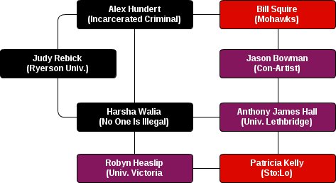 What’s most interesting about this is that Hall is another white person I’ve caught in the act of interfering with indigenous people. Hall, and members of the anarchist organization No One Is Illegal have interjected themselves into Patricia Kelly’s case at the Sto:Lo nation over an (also over-hyped) fishing dispute.