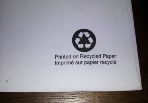 Have you ever noticed how recycled goods always seem to be printed with a notice that they are recycled- how sensible is that? Sure, on this envelope I’ve posted, it doesn’t take very much ink- but, how about on all of our envelopes combined- is there a significant environmental impact?