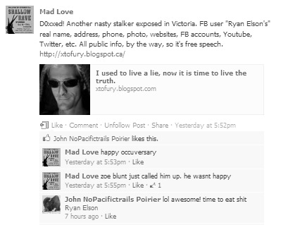 Members of PAOV, allegedly including Zoe Blunt, were brutal in their attack on Ryan. They compiled highly personal documentation on him including phone numbers, address, and personal history onto a webpage. But, even worse, they took a conscious effort to “out” Elson for being gay.