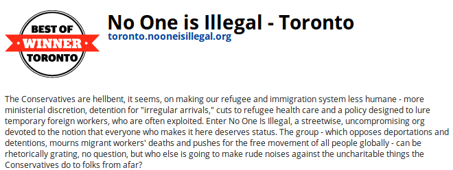An amazing thing happened this week- something that if it’s true, leaves me seriously disappointed with the people of Toronto. Why? Because, according to NOW Magazine’s 2012 Best Of Toronto poll, Torontonians believe that No One Is Illegal (NoII) is the city’s best activist organization. How can that be?