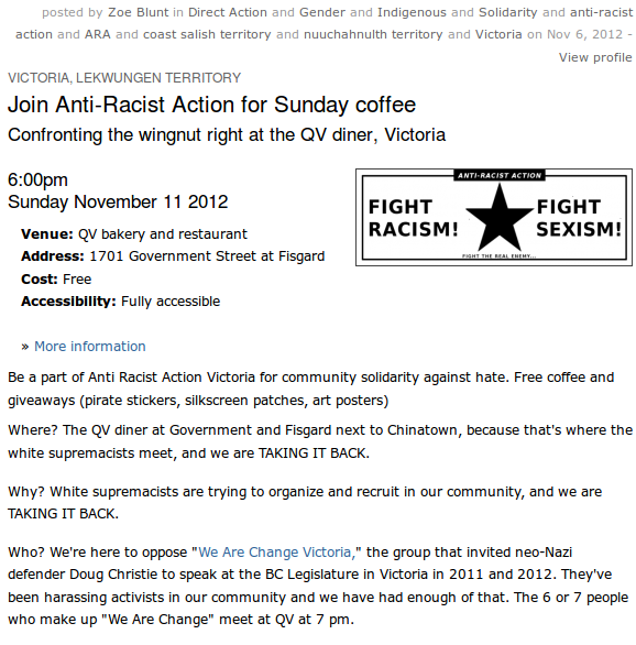 What’s happening right now in Victoria is an extreme example of the kind of damage that the anarchists can inflict on a community. The anarchists don’t like the people at We Are Change Victoria- they have differing ideas on environmentalism, and most of the people in WAC don’t support the ideas of old-left socialism. So, when the two parties met at Occupy Victoria, they spectacularly clashed.