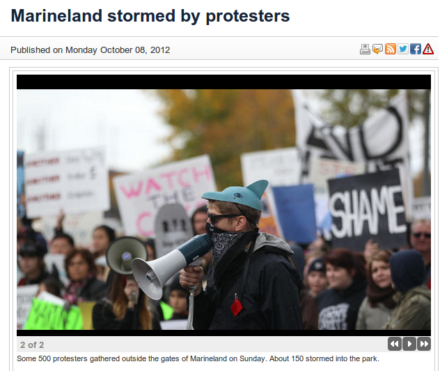 If this is a just a coincidence- well, there certainly are a lot of them. For example, Cheri DiNovo (who was also involved with GE-Hitachi) starts crusading against animal abuse at Marineland (a worthy cause), and next we see a group of anarchists invade the place. The Toronto Star had a great picture of Zach Ruiter there with a megaphone and a dolphin fin hat.