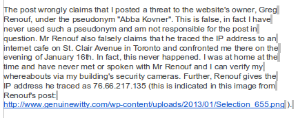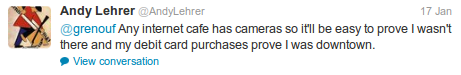 As you can see, Lehrer’s immediate response (an hour after the article was posted) said that he was out-and-about in downtown Toronto and that his debit card purchase will prove that. That’s kind of weak though- perhaps his fiancée had his card? He also indicated that he has no connections to the neighbourhood nearby the Internet cafe.