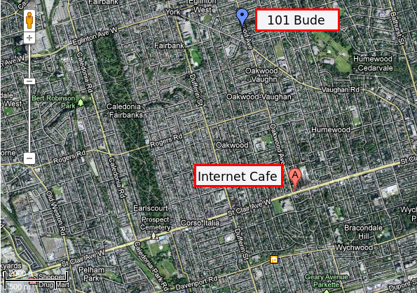 It’s Andy Lehrer’s listed address that’s most interesting here 101 Bude Street. There was a smile on my face the moment I looked it up- it turns out that the house at this address is only a very few short blocks from the Internet cafe where I first encountered him. Bingo!