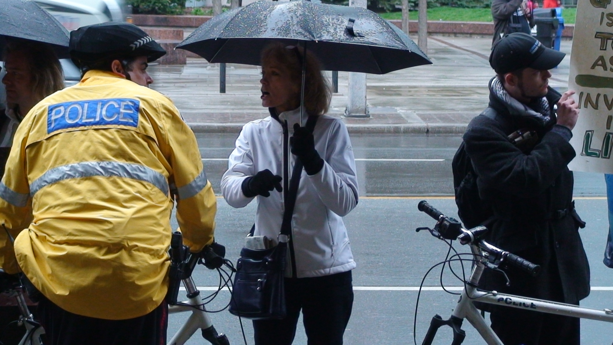 Had only they known the comedic relief waiting outside they’d have had a great opportunity to unwind- there’s always a good laugh to be had when the Activistocrats put on a show. Besides the signs, the giant puppet of Peter Munk (with an uncomfortably large nose), the marching percussion band, and the presence of a prominent religious leader, the protesters were blessed with one of the most comedic of the obedience cult’s characters- Dee Shanger (a.k.a Captain Yarr) a growingly notorious cop baiter who think’s he’s a pirate.