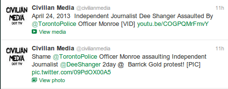 Here’s where Captain Yarr stepped in, Dee Shanger followed his normal pattern of bouncing up against the police with his notebook, yelling out his trademark phrase “I’m media” while live streaming video over the Internet entertaining those who like a good cop baiting but were unable (or too scared) to do it themselves. The last time we saw Captain Yarr do this was at the racist anti-police march NDP MPP Cheri DiNovo headlined at a couple of months ago.