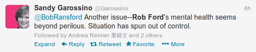 Garossino doesn’t only restrain her ugly tactics to journalists- she appears to be willing to take cheap shots at anyone who differs with her personal politics. Take this tweet she made yesterday about Toronto mayor Rob Ford: