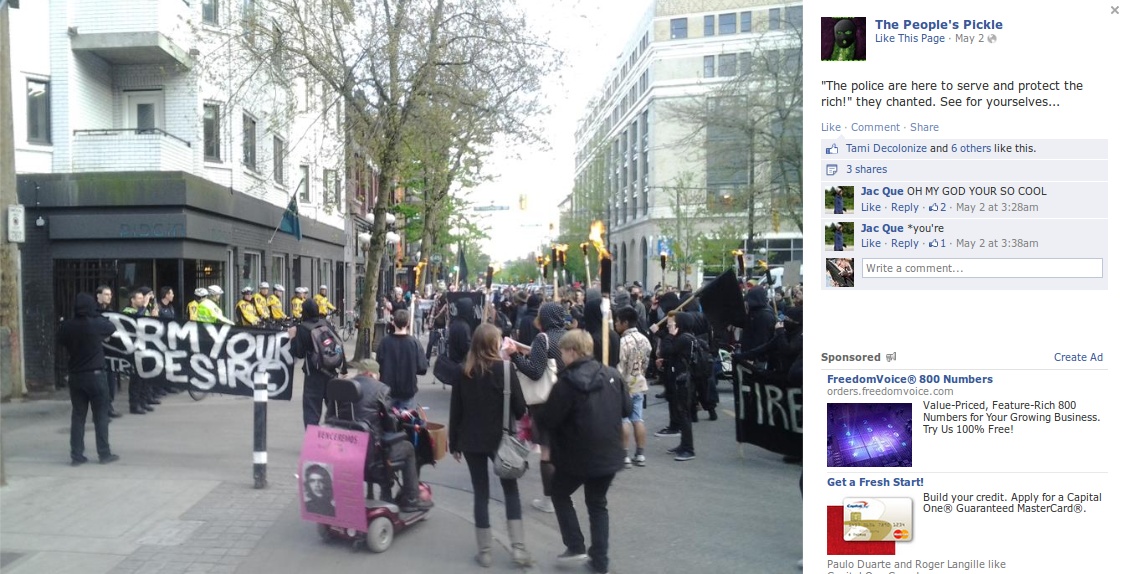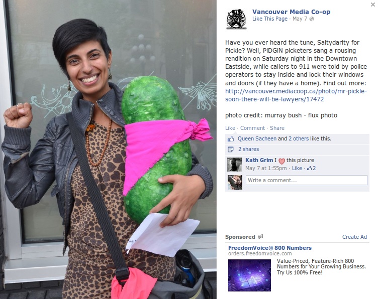 Protesters have taken focus on the $5 pickles, sometimes inflating the price (as high as $8), and often misrepresenting the dish as a single pickle. The (anarchist) Vancouver Media Co-Op encapsulated the pickle meme well with their picture gallery titled The Pickle Makes Us Strong.
