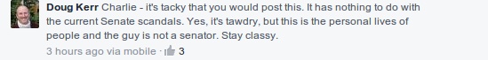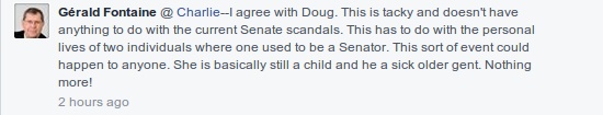 Angus epitomizes the narcissistic hypocrisy inherent of the NDP and the left,the delusions of self-grandeur and the do as I say and not as I do attitude.If any NDP Member’s wife had done this,Charlie would have defended it as progressive thinking.To childishly equate this bit of satire,as bad as it is,to the issues of the Senate belittles the seriousness of some Senator’s egregious behavior.
