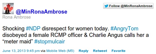 A few female MP’s responded demanding an apology. Rona Ambrose, who was the Minister for the Status of Women responded over Twitter:
