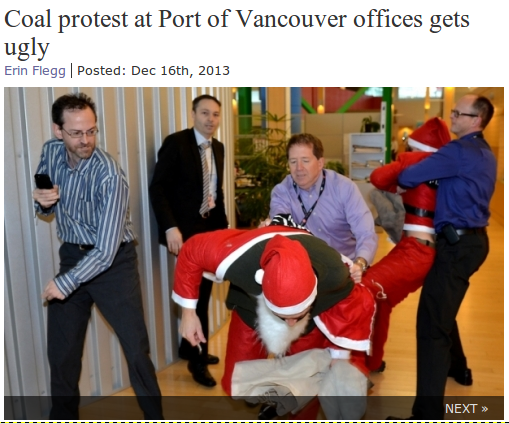 “Things turned violent when a handful of members of environmental activist group Rising Tide arrived at Canada Place this morning dressed as Santa and walked into Port of Vancouver offices with sacks of coal”
