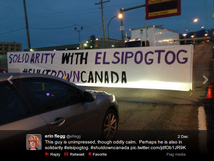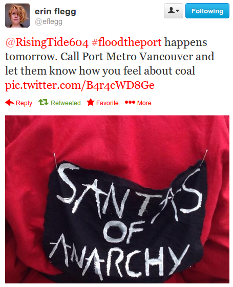 The Observer’s article was written by a young woman named Erin Flegg. Looking at her Twitter account, one can see she has a close relationship with the protesters, and was embedded in their last three events; the Santa Claus invasion, invading Christy Clark’s privacy protesting in front of her home, and a wildcat protest blocking trucks from accessing the port.