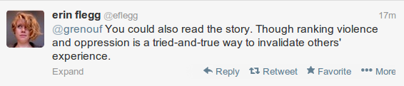 Your Humble Narrator was curious to hear Erin Flegg’s explanation for her slanted article, so contacted her by Twitter. Much like her article, her first explanation was knee-deep: