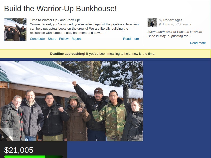 Knowing this, it’s both surprising and not at all a surprise to see that Ages is handling the money for the Unist’ot’en Camp’s new fundraiser. Their plan is to build a $20,000 structure on the Crown land they’re occupying- they’re calling it the “Warrior-Up Bunkhouse”. They’ll build the structure with a “volunteer group including carpenters and helpers from both Galiano Island and the mainland has come together to answer the call”.