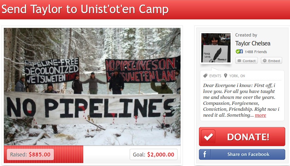 No militant protest would be complete without the participation of one of the elite group of activists (often called Activistocrats) with the Love Is The Movement tattoo. In this case we have Taylor Flook, formerly one of the leaders behind Occupy Toronto- she’s also a regular at Toronto’s anti-police marches. Flook is in the process of raising $2,000 to pay for her trip up to the camp. The way she describes her motives is quite telling: