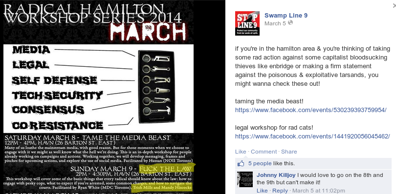A couple days after the protest was shut-down, #SwampLine9’s Facebook accounted proudly promoted that people had been (in solidarity) tampering with local trains. Environment Hamilton has some messed-up ideas of who to promote as role models.
