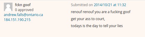 The judge allowed me to leave the courtroom after the exchange. I checked my website when I got home (the email and IP address aren’t visible on WordPress’ Android app) and I was curious to see if the defence used the court’s network when he sent the message. He didn’t, it was posted through a Bell connected mobile phone, but there was one more shock for me- the email address. It appears the defence forged his message to make it appear it came from a crown attorney.