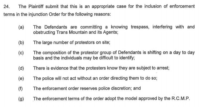 One last thing stuck-out when reading through Kinder Morgan’s filing. It comes from section 24 of Part III where their lawyers summarize their case for why the court should approve the injunction. Their lawyers stated in parts “a” and “d” that the protesters were aware of the fact they were committing an offence and knew this made them subject to being arrested.