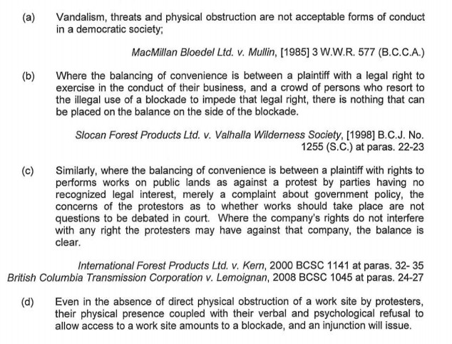 The defendants had every right to protest, and have every right to voice their complaints- there’s no evidence these rights had been violated. As already mentioned, what they don’t have the right to do is impede the rights of others. But don’t take my word for it, BC courts have covered this issue ad-nauseum.