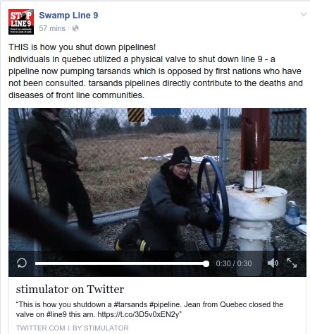 A video was released this morning by Al Jazeera associate Franklin Lopez of a Quebec protester tampering with Enbridge’s recently reversed Line 9 pipeline. In the video a village idiot named “Jean” simultaneously complains about how “old” Enbridge’s recently inspected and upgraded pipeline is while manually shutting it down. This is outrageously stupid, and not the action one would expect from someone who respects the environment- they know nothing about how pipelines work, shutting it down without notifying the control room could cause serious environmental damage.