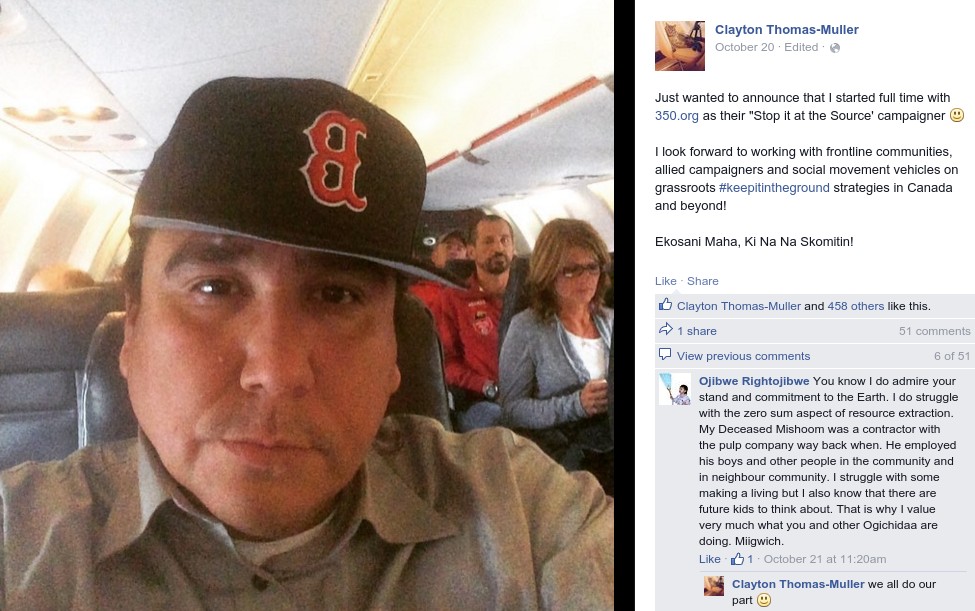 Doubling down on hypocrisy of a being a high-flying climate activist, Clayton is also a brand loving anti-capitalist. He proudly wore his Boston Red Sox cap in his airplane selfie celebrating his employment at 350. In a recent Facebook discussion on notebook technology with Greenpeace’s Melina Laboucan Massimo Clayton expressed his love for Apple Macbooks. On his September 2015 trip to New York City Clayton washed-down his Boarshead sandwich with a plastic bottle of Fiji water.