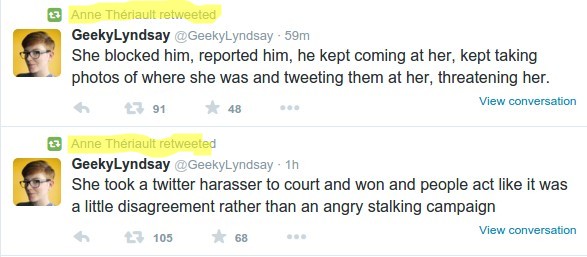Thériault claimed in her Canadaland story that she attended most of Elliott’s trial- but something doesn’t compute. She retweeted a couple messages back in July by another of Guthrie’s friends. The tweets were outright lies. The first claimed that Elliott was taking Guthrie’s pictures and sending threatening tweets. The second claimed that Guthrie took Elliott to court and had already won the case. Both claims are completely inaccurate- truth isn’t important to Team Guthrie.
