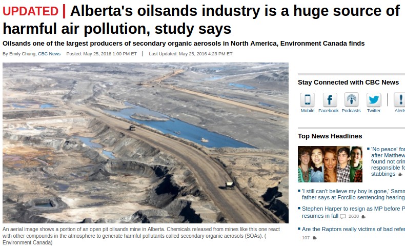 In August and September 2013, scientists from the federal Environment Ministry filled a plane filled with “sophisticated scientific instruments” and collected air quality data on 20 separate four-hour flights. The CBC reported that they “followed plumes of pollution from the oilsands as they headed downwind,” collecting data as air particulate turned into Secondary Organic Aerosols (SOAs)- pollutants created by a chemical reaction when floating particles interact with sunlight.