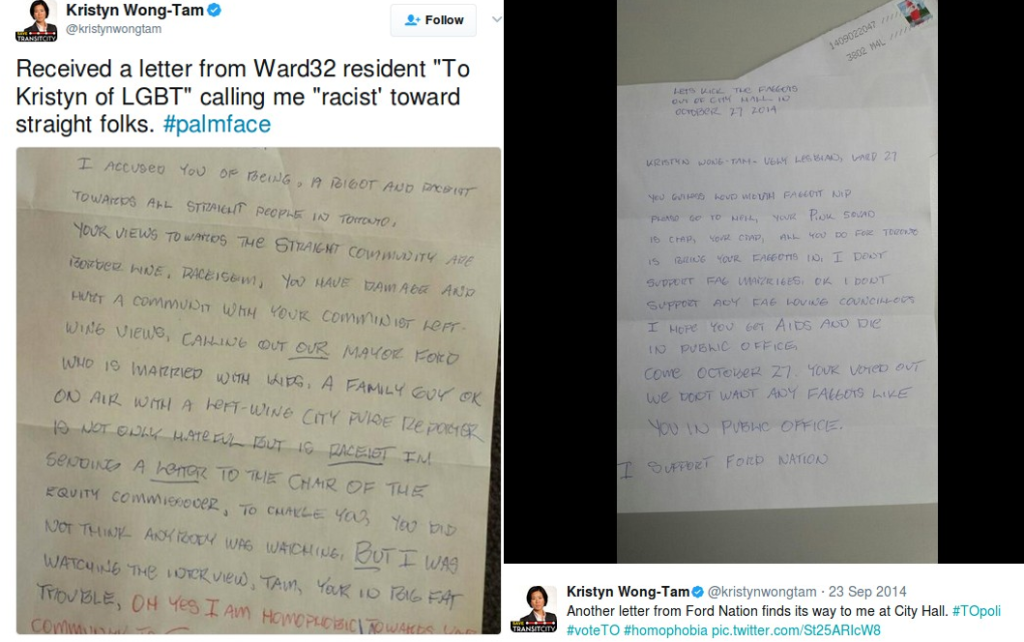 Wong-Tam tweeted out the second letter on September 22, 2014. It was addressed to “Kristyn Wong-Tam ugly lesbian”. It was more hateful than the previous with derogatory comments about “faggots”, and the ugly comment “I hope you get AIDS and die in public office”. The letter closes off saying “I support Ford Nation”.