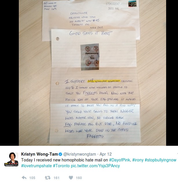 Two weeks ago Toronto City Councillor Kristyn Wong-Tam tweeted out a picture of a hate-filled letter that was mailed to her office at City Hall. The envelope was postmarked on April 10th. It’s unknown when her office actually received it but she tweeted out images of both the letter and envelope on April 12th- the Day of Pink, an “International Day against Bullying, Discrimination, Homophobia, Transphobia, and Transmisogyny.”