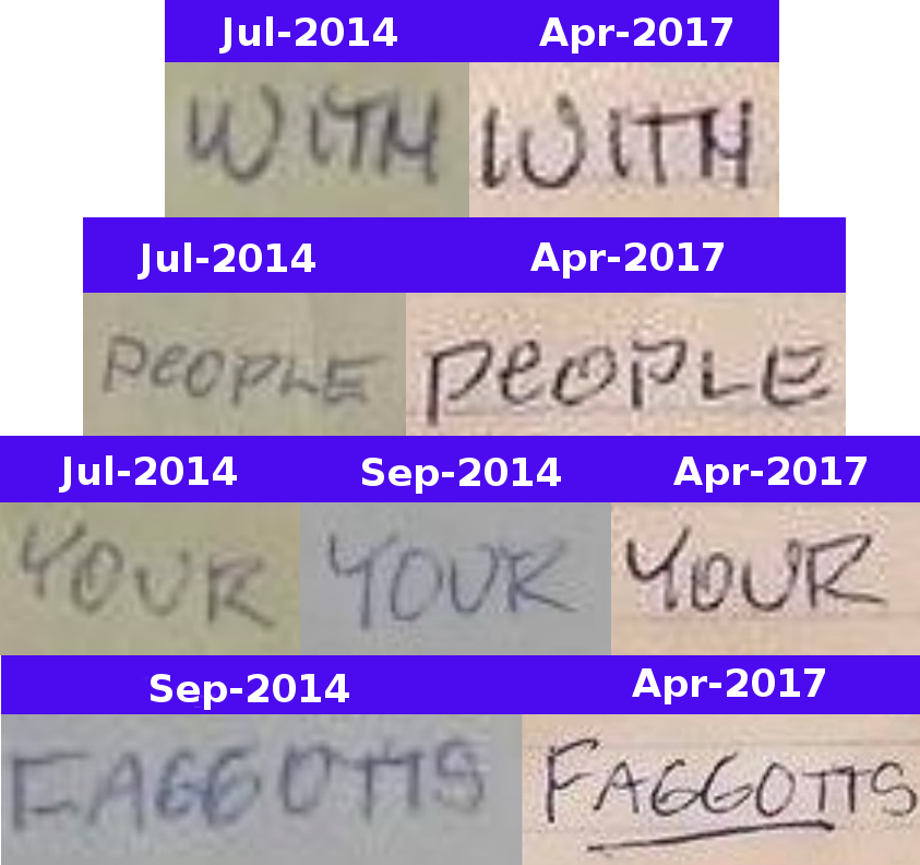 After careful analysis of the three hate mails Wong-Tam tweeted out, it seems apparent that they were all written by the same individual. As shown in the above screenshots, the handwriting is pretty much identical. Other similarities include how the writer underlined words they wanted to empathise, and the common misspelling of the word “faggotts” (the proper spelling only has a single “t”).