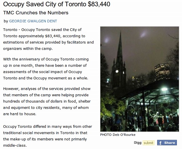 The Toronto Media Co-Op put out a rather humorous story today, claiming that Occupy Toronto saved the city of Toronto $83,440 during it’s encampment. First, the story is a day late and a dollar short- Eric Hamilton-Smith did this at Occupy Vancouver last November. But, at least, they admit that his work is the motivation for theirs. More importantly, the numbers they have cooked are way off.